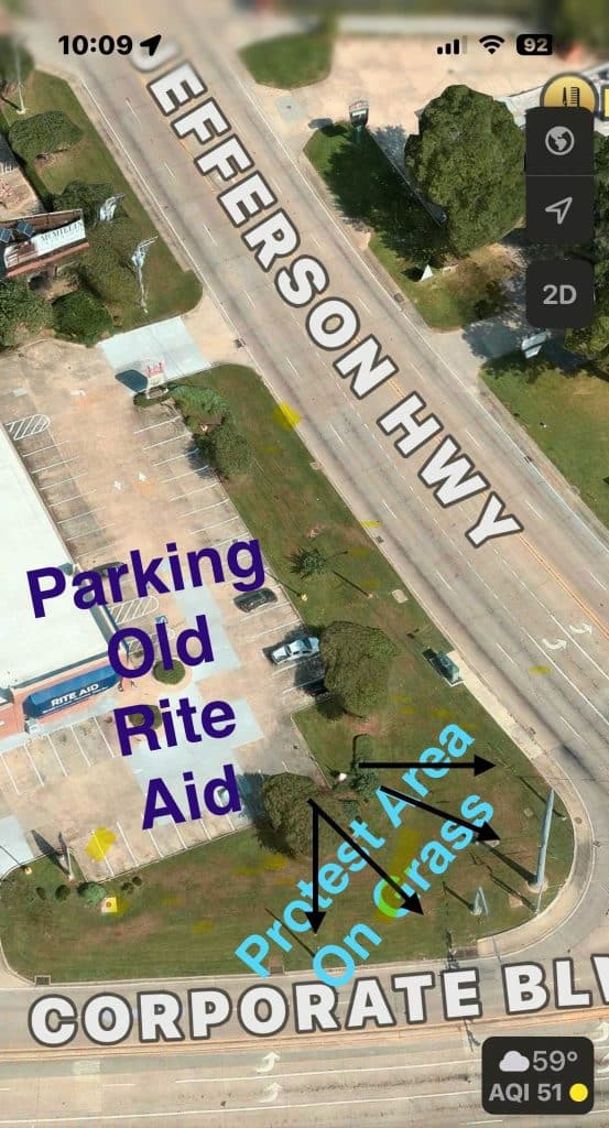 January 3, 2026. We will hold our third Show Up Saturday protest in the elevated grassy area at the corner of Corporate Boulevard and Jefferson Highway. Parking will be available at the closed Rite Aid pharmacy on that corner. Bring water, appropriate clothing who knows what the weather will be, and your creative sign to stand in solidarity against the outrageous Trump administration.