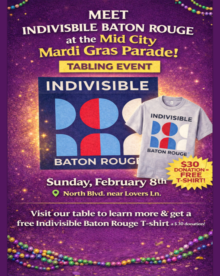 We’ll be out along the Mid City Mardi Gras Parade route with a table set up—come say hello and learn more about what Indivisible Baton Rouge is working on!