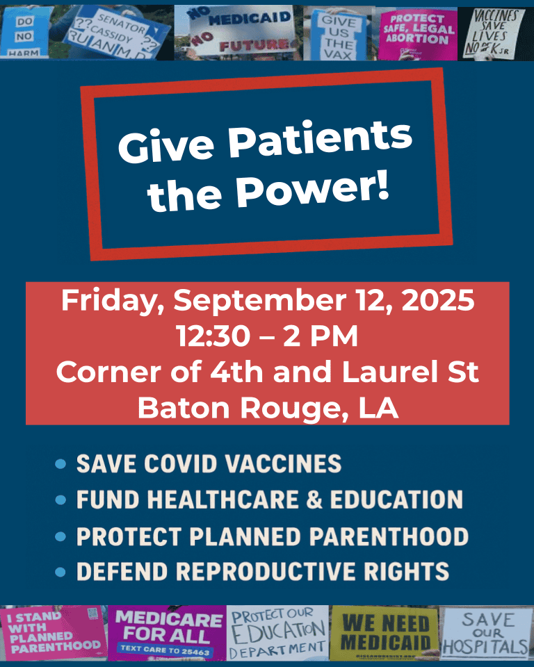![]() POP-UP DEMONSTRATION Bill Cassidy: Give Patients the Power! Corner of 4th and Laurel St., Baton Rouge, LA Friday, September 12, 2025 12:30 – 2 PM Senator Cassidy recently said that a blanket prescription would “give the patients power.” We agree! Patients deserve the power to access the care we need: Join Indivisible Baton Rouge to demand healthcare ... Read more |