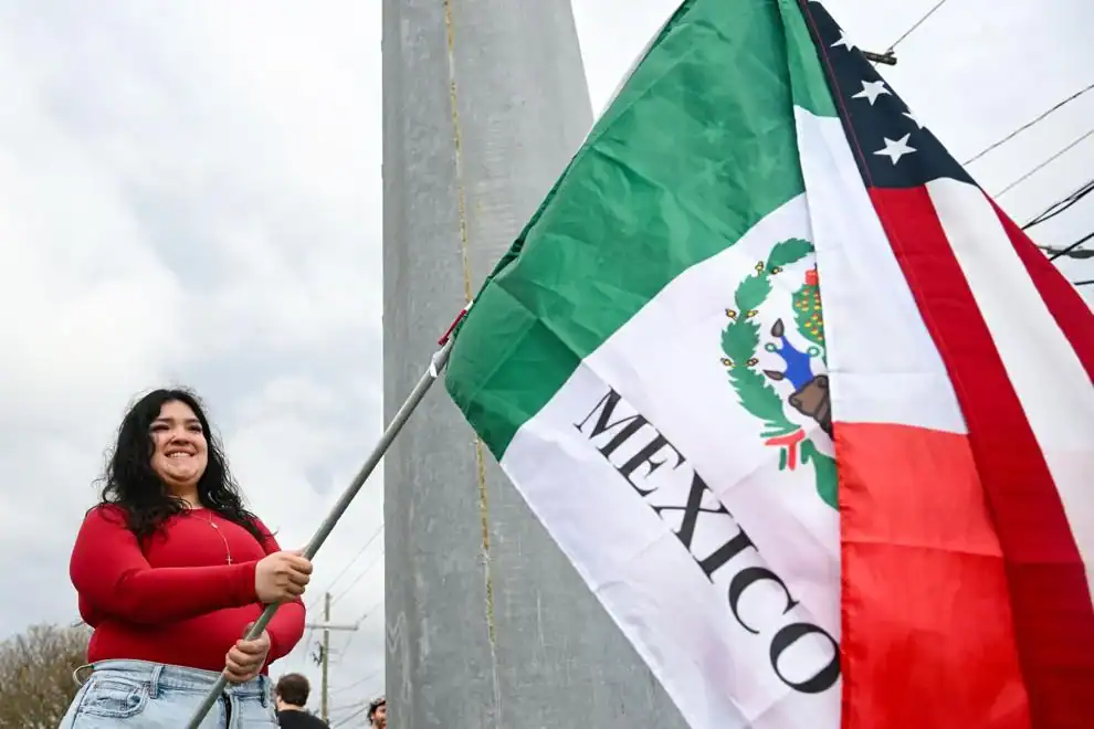 Angela Juarez waves an American and Mexican flag together during an anti-ICE protest organized by Indivisible Baton Rouge at the corner of Jefferson Highway and Corporate Boulevard on Saturday, January 10, 2025.