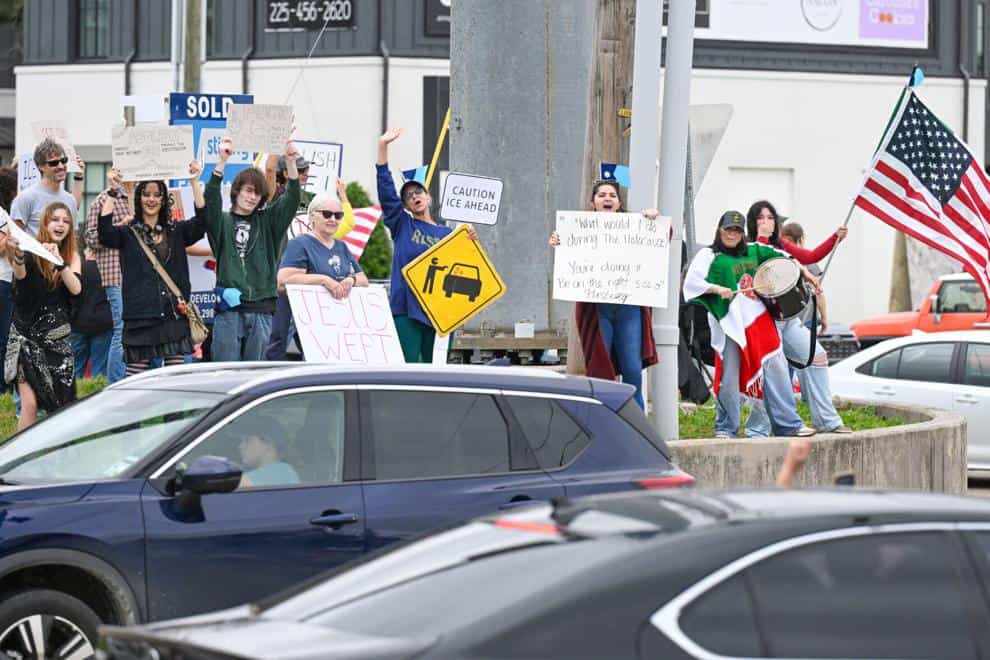 Protesters hold their anti-ICE signs to passing traffic during a protest organized by Indivisible Baton Rouge at the corner of Jefferson Highway and Corporate Boulevard on Saturday, January 10, 2025.